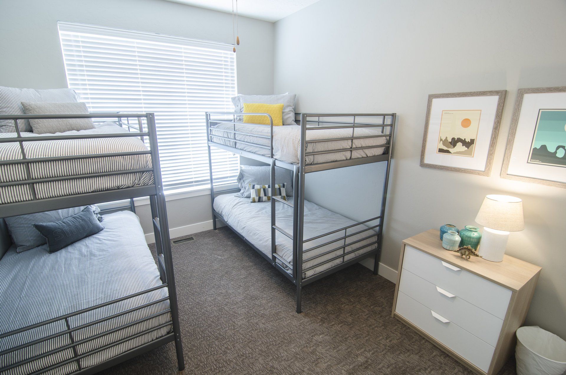 Both townhomes sleep 12-16 people. 1 king, 2 queens, 4 bunks, a hide-a-bed, crib and four twin auto-inflate air mattresses are available.